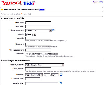 このページに必要項目を書いて登録して下さい。ヤフーフリッカーの ID とパスワードを取得できます。