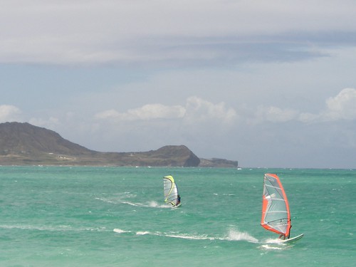 昨日はカイルアビーチにウィンドサーフィンをしに行った。 トレードウィンドがビュンビュン吹いていて、白い波間をフルスピードで疾走できた。 おかげで今日は筋肉痛でヴァイオリンの練習とレッスンになった。 下の写真で乗っているのは僕じゃないけど、こんな感じ。 次回は自分の乗っているところを撮ってもらおう。